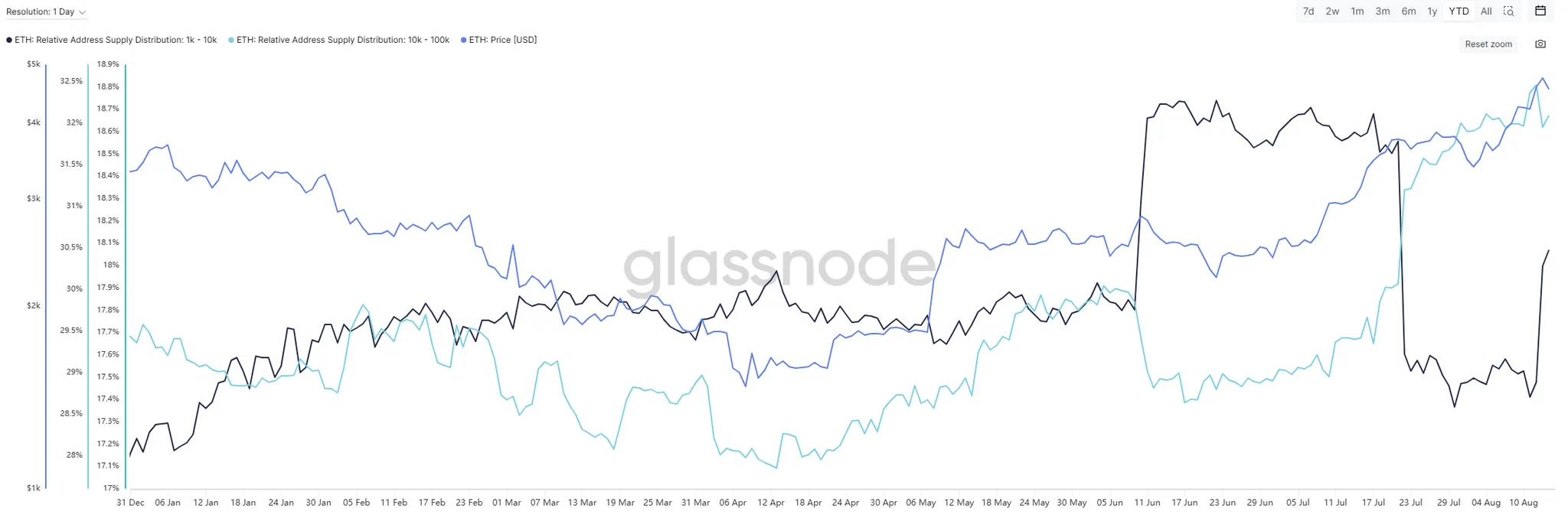 10K-100K ETH 地址:8.13 持币占比明显下降,与 ETH 价格形成背离(历史上二者高度相关),直接引发 8.14 回调;8.14 回调后占比再度拐头向上,需跟踪其持续性。