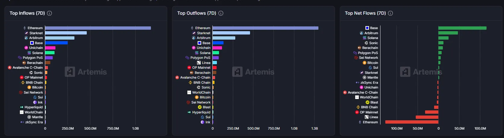 资产流向:Base、Arb 链净流入最多,ETH 链虽有净流出但因总量基数大无虞,可重点关注 Base/Arb 生态项目。