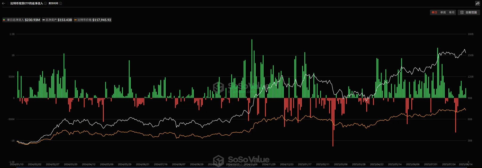 资金特征:流入集中在周初(推动 BTC 突破阻力)与周末(8.14 价格回落时抄底),周中高位时流入减少,体现机构 “低买” 策略。