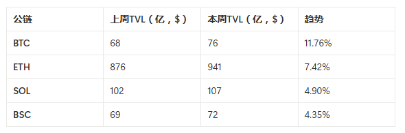 本周链上TVL小幅增长,整体情况较好,特别是eth链 增长明显。