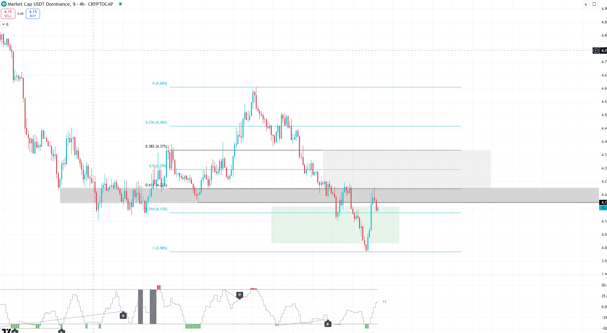 USDT市占率最终还是在4小时级别潜在反转区配合指标超卖走出反弹,目前反弹已经来到4小时级别结构阻力和这段下跌的0.618的关键水平位,短期来说有受阻回落的可能性,USDT市占率一般和大盘成反比关系,若回落出现则意味着大盘将有一段反弹即将出现。