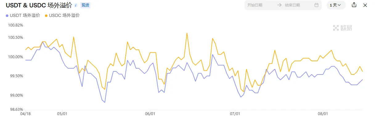 USDT 与 USDC 场外溢价率本周整体处于震荡区间,未出现牛市 “FOMO 式轻微溢价”,但 8.12 回调后溢价率开始向上拐头,显示部分场外资金进场抄底;8.14 再度极速回调后,需关注溢价率能否持续回升,判断场外资金承接力度。