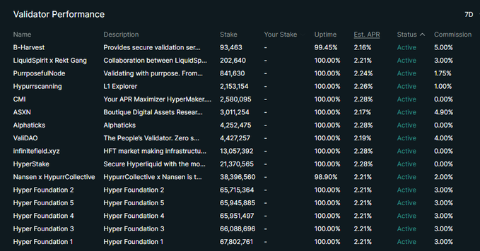 在质押层面,我们可以把Hyperliquid当作一个常规的POS链来看,目前官网上支持用户去质押代币运行Hyperliquid验证者节点,系统会根据你的节点的表现来分发激励。