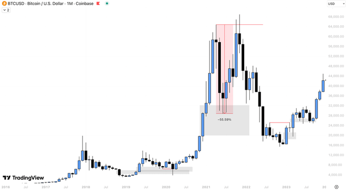 回顾过去周期,比特币总是在创下历史新高(ATH)后迎来 50% 以上的剧烈回调,市场在恐慌中误以为牛市结束。但每次结果都是一致的:恐慌过后,再创新高。
