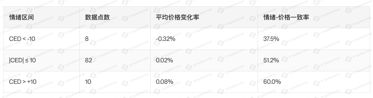 趋势结论:情绪极端化阶段(|CED|>10)往往对应价格反转信号。当CED>+10时价格表现相对较好,但一致率仅60%,显示极端乐观情绪下价格上行压力较大;CED<-10时价格平均下跌且一致率最低,表明极端悲观情绪更容易引发价格反弹。