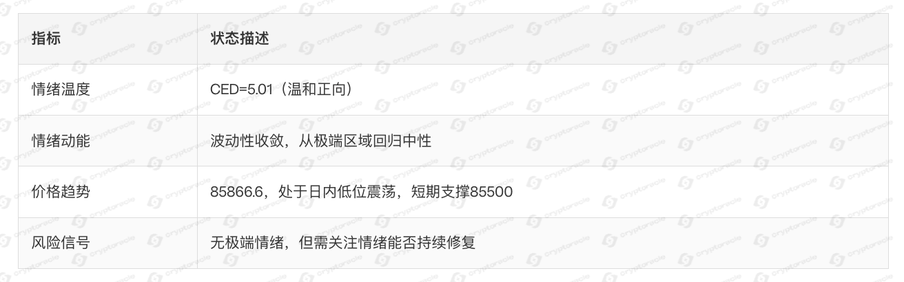 当前BTC市场情绪完成极端波动后回归温和正向,但价格仍处日内相对低位。情绪与价格出现一定程度背离,短期存在技术性反弹需求。市场风险偏好有所修复,但缺乏强劲上行动能,预计将维持震荡整理格局。建议关注85500支撑位有效性及情绪能否持续改善。