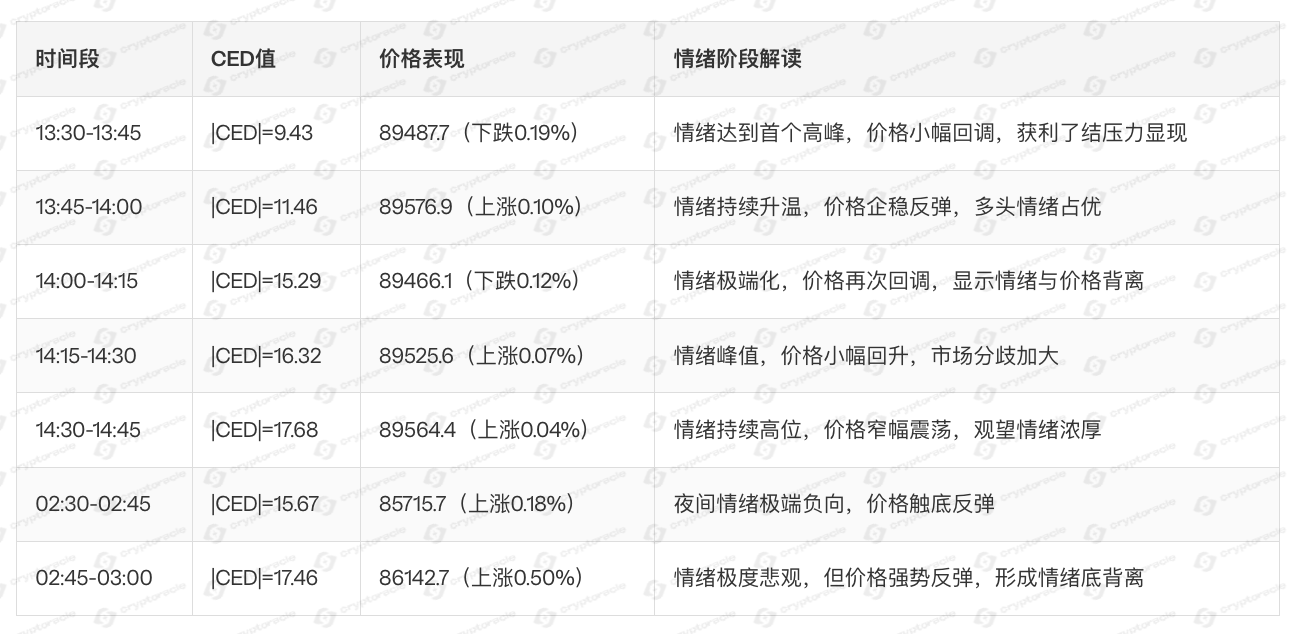 日内情绪变化节奏:上午情绪波动剧烈,CED在±10区间频繁切换;午后情绪持续升温至极端水平(14:00-15:00);晚间情绪快速回落并转向负向,夜间出现深度情绪极端化(02:00-03:00),尾盘情绪逐步修复。