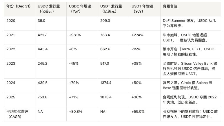 七、附录参考:USDC vs USDT 过去6年增长表(2020–2025)