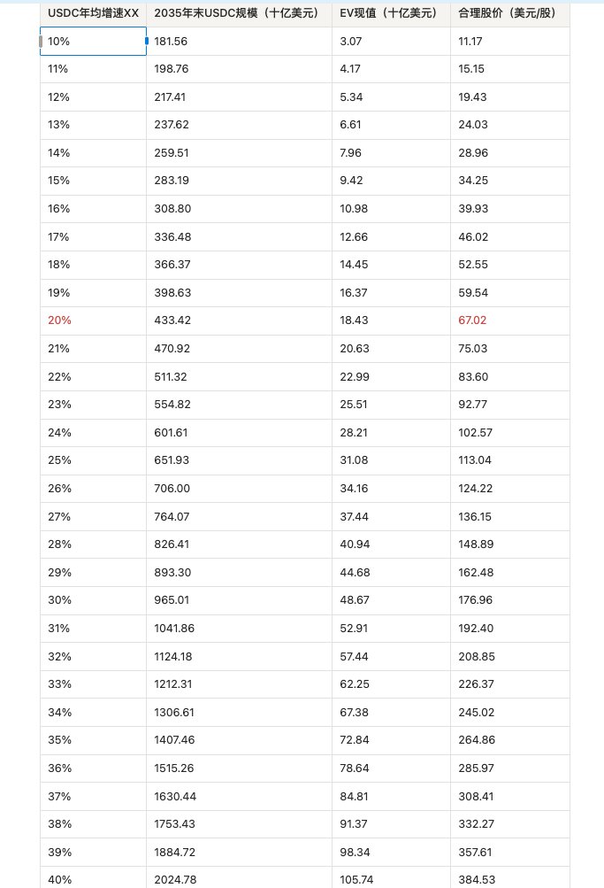 给Circle(CRCL)估值是不容易的,何况是按照自由现金流折现(DCF)模型,里面的关键参数改动一些,就会相差很大。只能在相对保守的思路下,试图寻找一些模糊的正确。