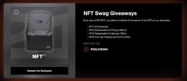 所有与会者都可以领取免费的 NFT Swag 和商品 NFT。这些 NFT 可以兑换实物商品,甚至获得免费饮料。NFT.NYC 2022 中提供的所有 NFT Swag 都被认领完。