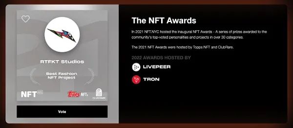 NFT.NYC 年度大奖颁发给了 56 个不同类别的顶级艺术家、品牌、区块链和项目。通过 Twitter 民意调查接受提名,并使用 HubSpot 表格进行投票。该奖项由 OpenSea、APENFT、Livepeer 和 Tron 共同主办。