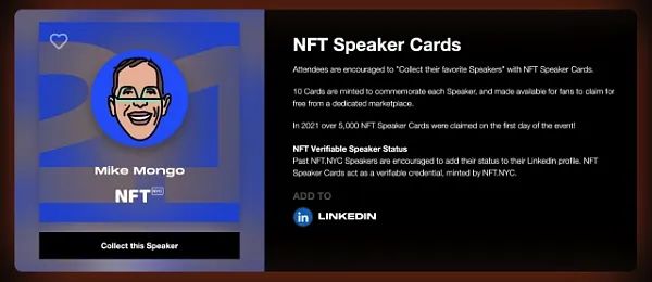 所有 “扬声器”NFT 都具有实际用例,演讲者可以将 NFT 添加到他们的 Linkedin 个人资料中,作为他们对活动贡献的证明。