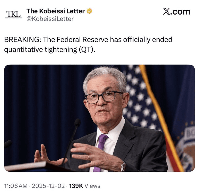 美联储正式结束QT(量化紧缩)——全球风险资产最大的刹车被彻底松开。