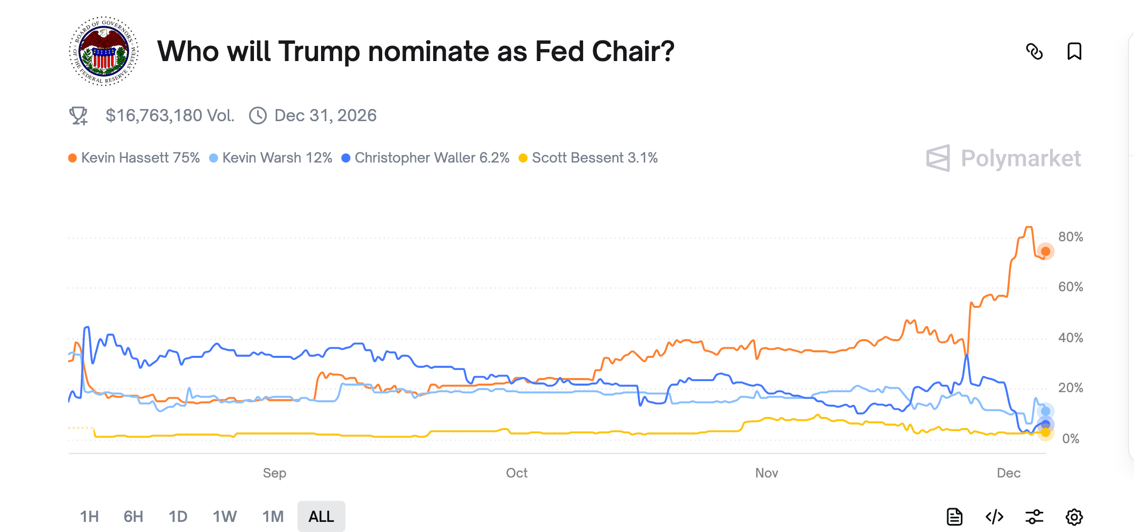 截至12月5日,在Polymarket等预测市场平台上,哈塞特当选的概率约为 75%;彭博等主流媒体此前也援引消息人士称,哈塞特已经成为接替鲍威尔的“头号热门”。而特朗普本人则在公开场合表示已经做出决定,将在 2026 年初正式宣布人选,并多次在采访中点名称赞哈塞特。