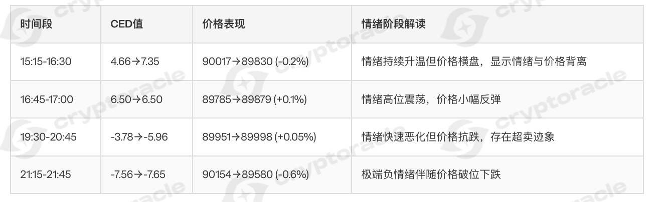 过去24小时内,BTC情绪总体呈现先正后负再反弹的波动格局。情绪CED值在[-7.56, 7.35]区间内震荡,整体偏向中性偏负。