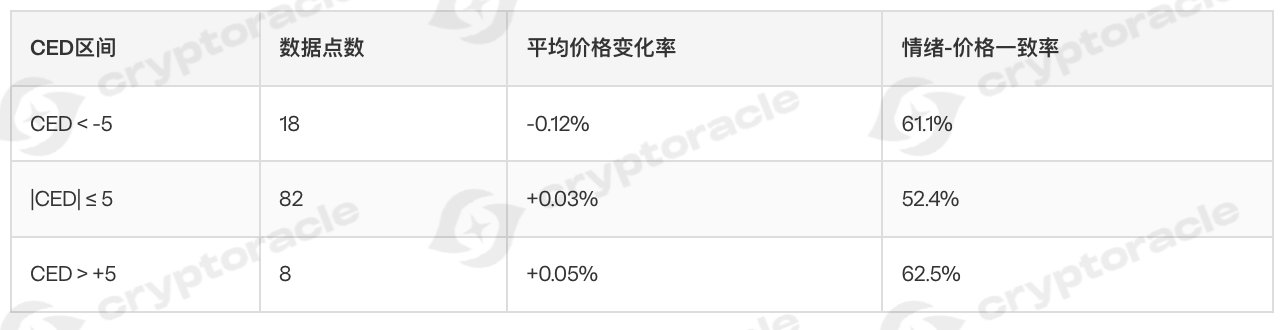 趋势结论:极端情绪区间(|CED|>5)的情绪-价格一致率明显高于中性区间,显示情绪极端化对价格方向有较强指引作用,但价格变化幅度相对有限。