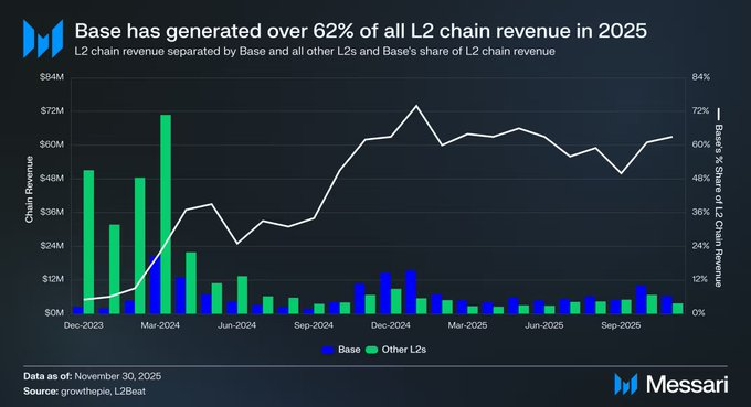 • 收入增长与市场主导地位:Base在2025年进一步巩固了其以太坊L2龙头地位。其链上收入从2023年12月的250万美元(占L2总营收5%)大幅增长,至2025年已实现7540万美元收入,占L2总营收的62%。