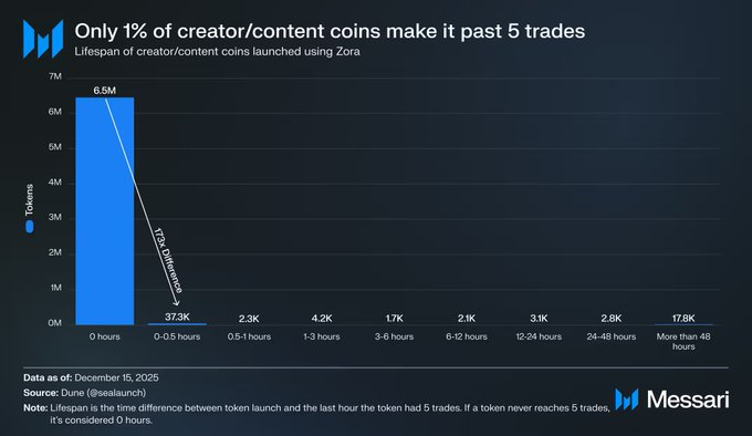 截至目前,通过Zora实现代币化的创作者与内容代币总量已超过652万个。其中,645万个(约占总量的99%)未能达成五次交易。仅有1.78万个代币(占总量的0.3%)在发行48小时后仍保持交易活跃度。