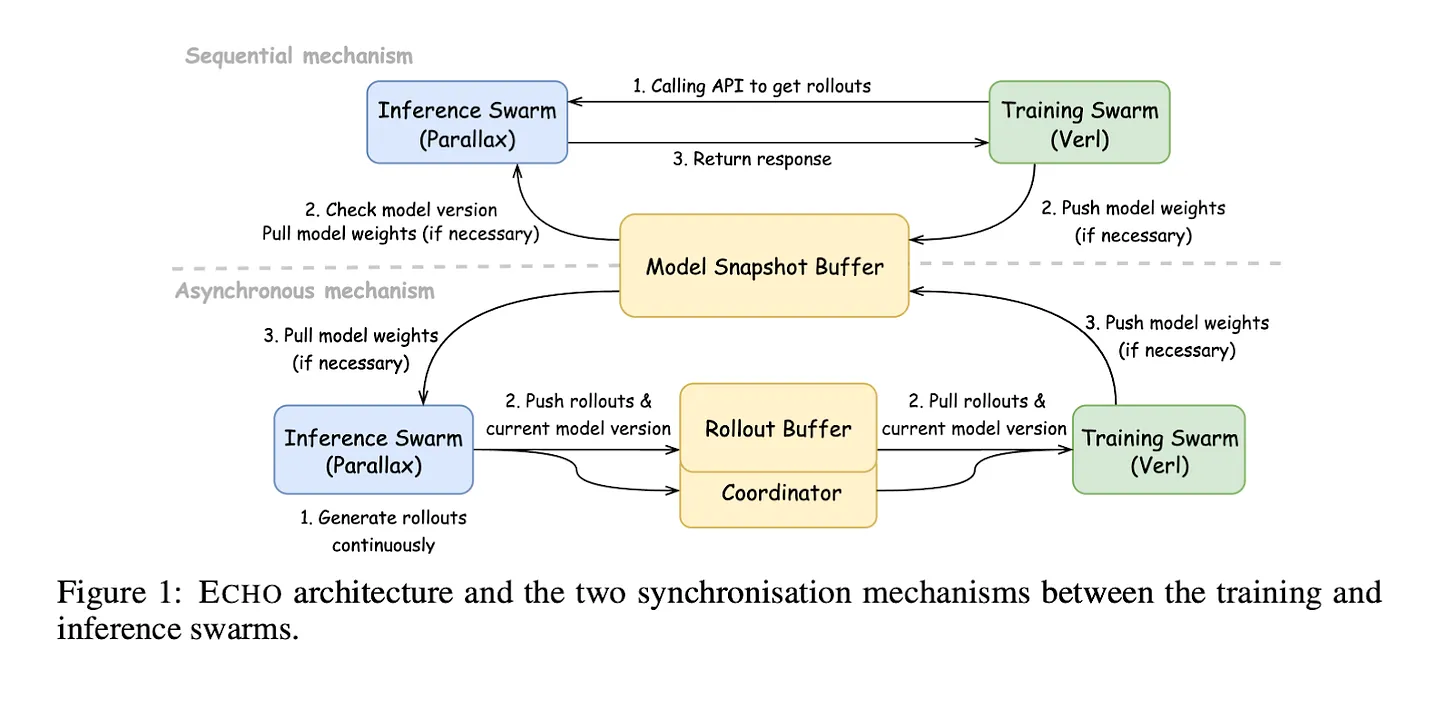 Echo将这两个阶段部署在不同的硬件上。推理集群使用Parallax在全球的消费级电脑上运行。RTX 5090或MacBook M4 Pro等多个消费级设备同时生成训练样本。训练集群使用A100等高性能GPU快速改进模型。