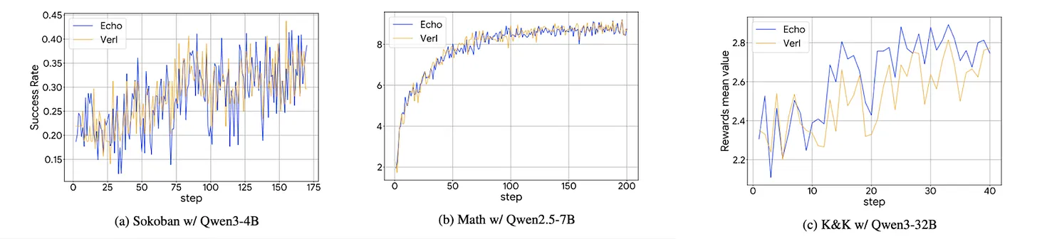 结果证明Echo有效。Echo实现了与现有强化学习框架VERL相当的性能。个人和小型企业现在可以在分布式环境中为其特定目的训练大语言模型。Echo显著降低了强化学习的门槛。