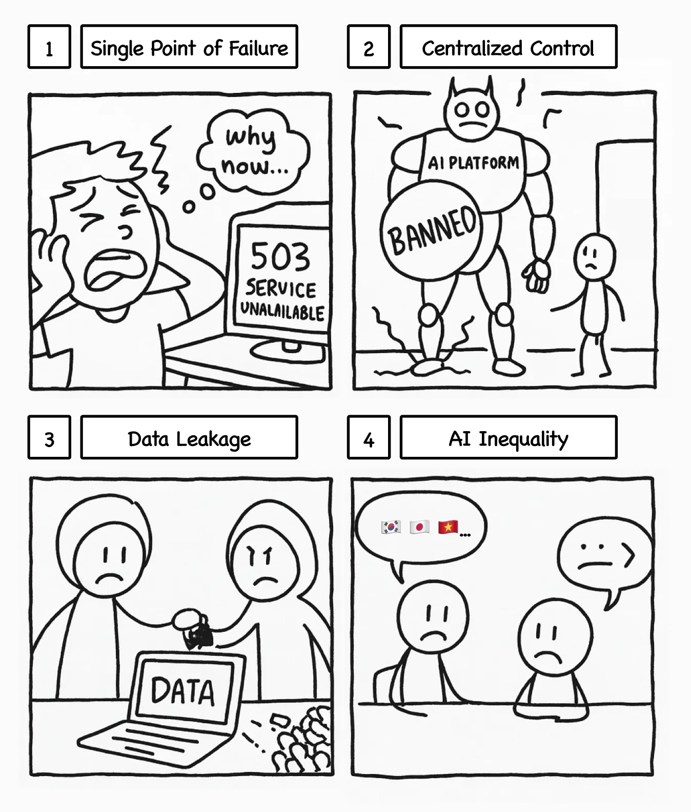 想象一下,如果这些公司撤销大语言模型访问权限会怎样。服务器中断可能导致服务停止。公司可能因各种原因封锁特定地区或用户。价格上涨可能将个人和小型企业挤出市场。