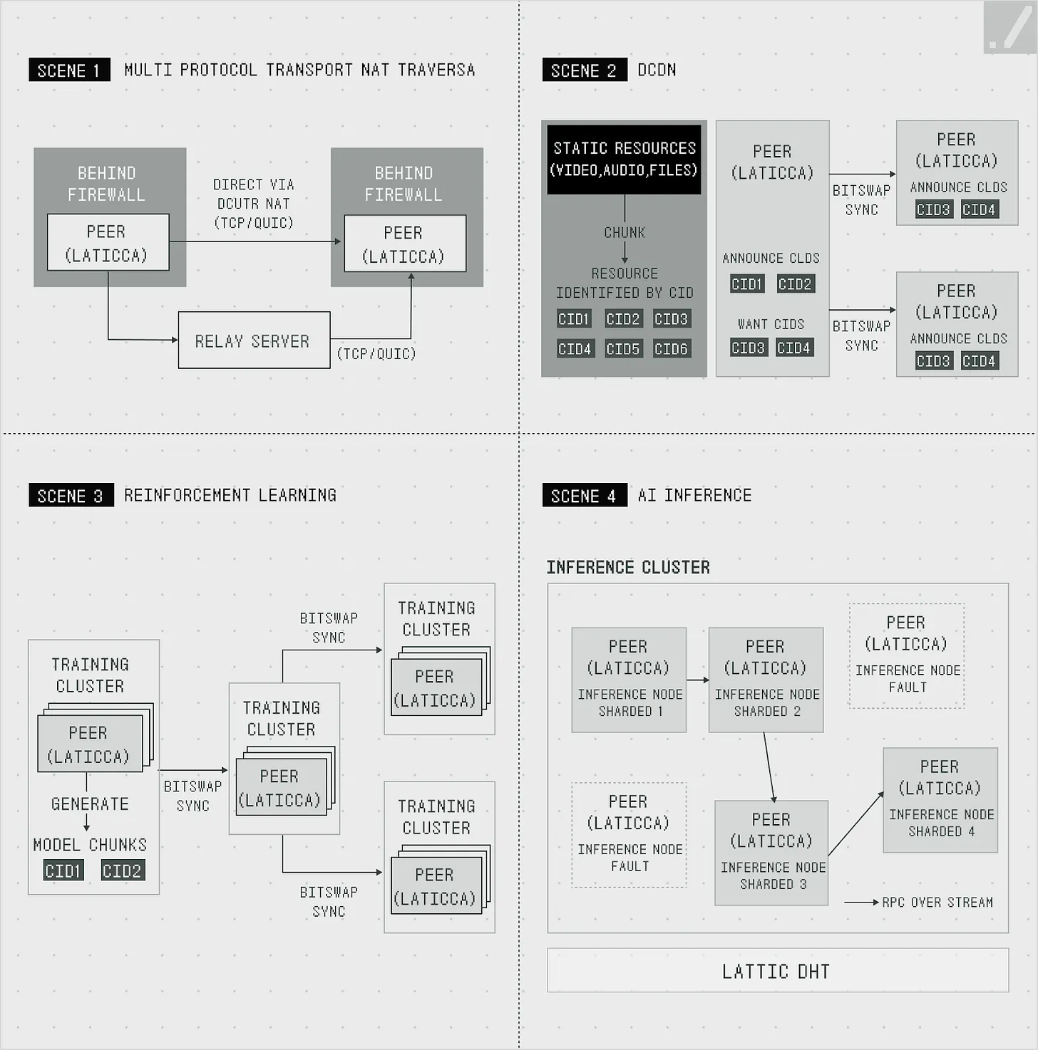 Lattica在分布式环境中实现了稳定高效的数据交换。该协议支持AI训练和推理,以及分布式视频流等应用。Lattica的demo展示了它的工作原理。