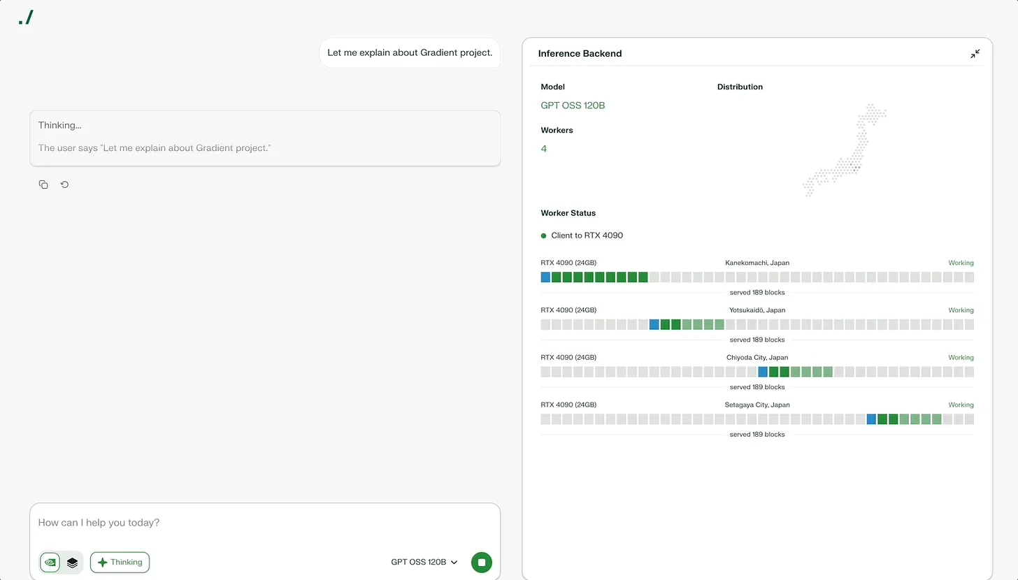 Gradient以不同的方式解决这个问题。虽然大型科技公司用数万个高性能GPU建造大规模数据中心,Gradient却将全球闲置的计算资源连接成一个分布式网络。家用电脑、闲置的办公服务器和实验室GPU作为一个巨大的集群运行。