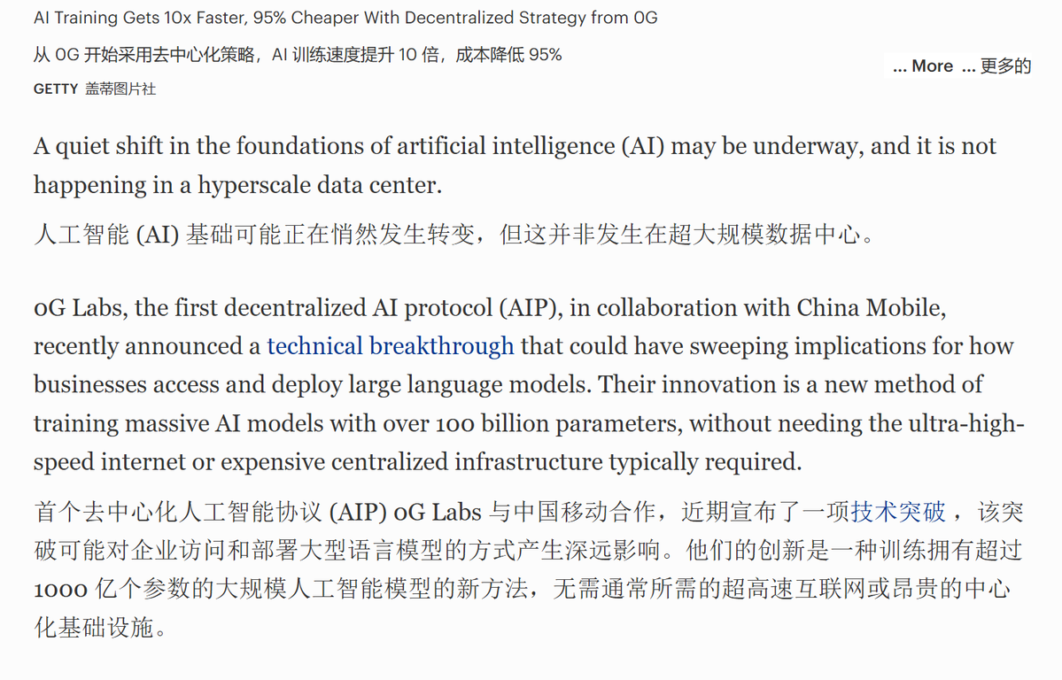 根据福布斯数字资产频道的报道,0G与中国移动合作,宣布了一种高速度、低成本的AI训练框架——DiLoCoX。