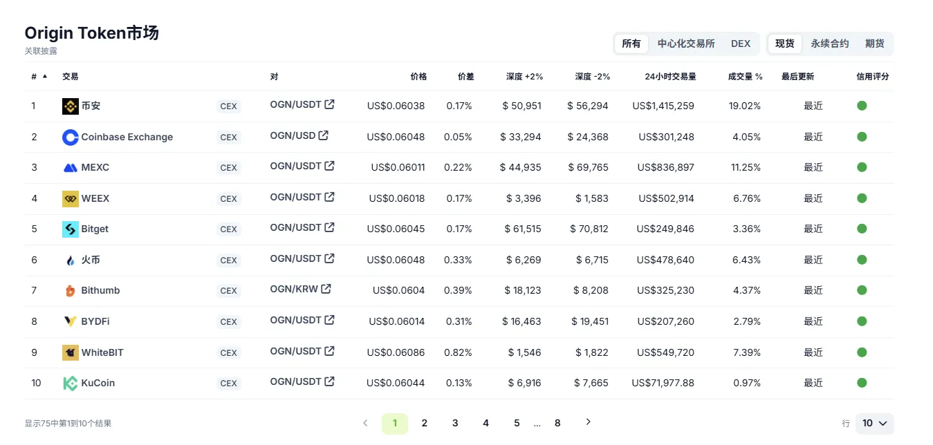 从市场流动性深度角度来看,OGN 在日常情况下,各大所维持±2% 内 50,000~100,000 美元左右的流动性,属于相对不错的标的。如果按其当前市值来看,则属于较为优秀范畴。