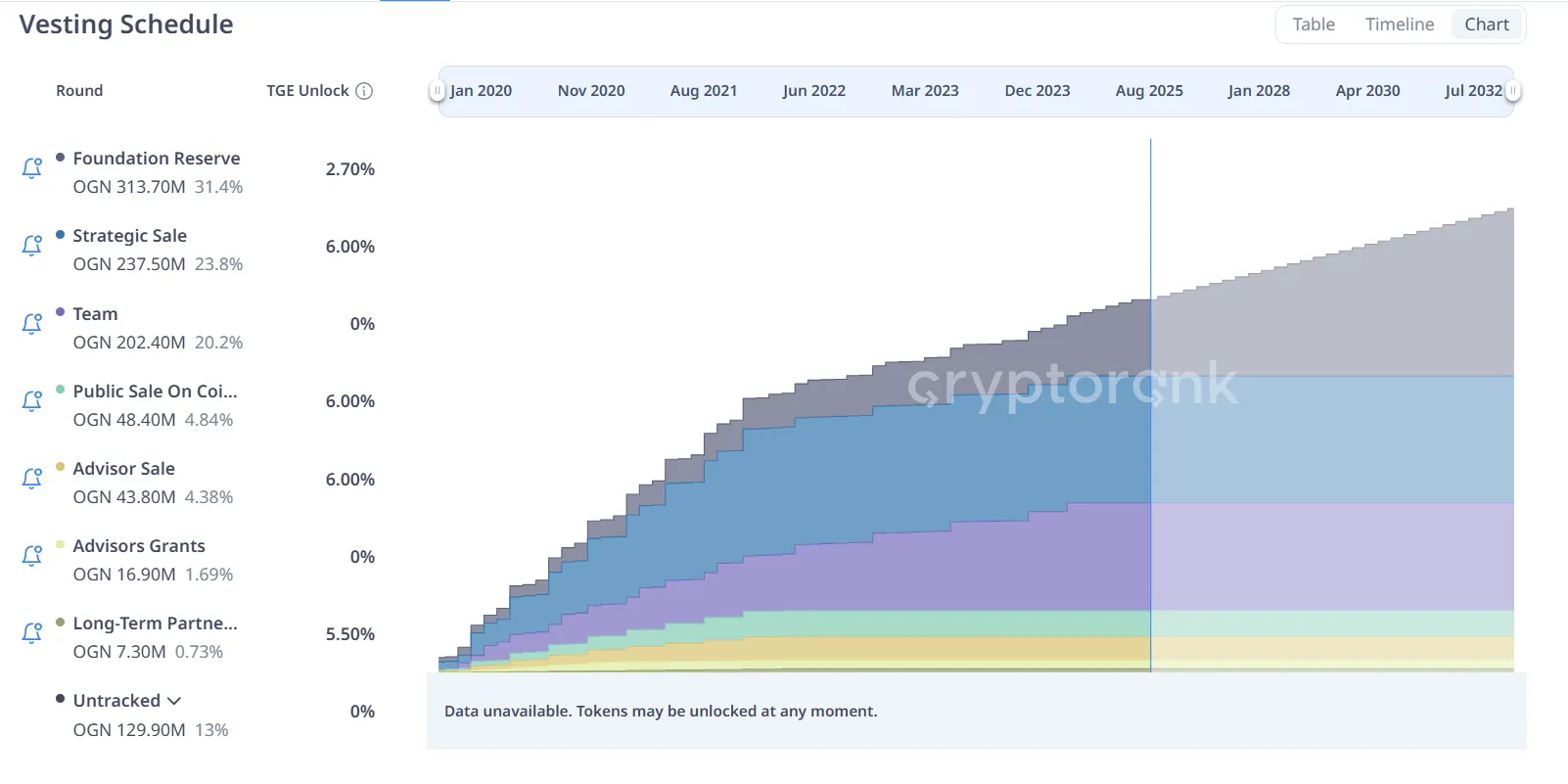 尽管 CryptoRank 数据相对不全,且 OGN 仍有接近 50% 的代币尚未释放,但目前来看 OGN 后续的释放速率相对此前更为缓慢可控。