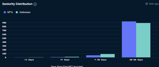 目前共有2.5k个钱包地址持有Loot NFT。有趣的是,尽管Loot项目如此火热,根据Nansen的数据,并没有“亿万”的巨鲸钱包持有Loot,但是约100个“传奇”钱包持有Loot(“亿万”和“传奇”是Nansen对钱包状态的标签)。Loot 的持有相对分散—大约62%的 Loot 持有者只拥有一个 Loot包裹。这意味着更多的人将参与到Loot社区,并且有动力去建设这个社区。