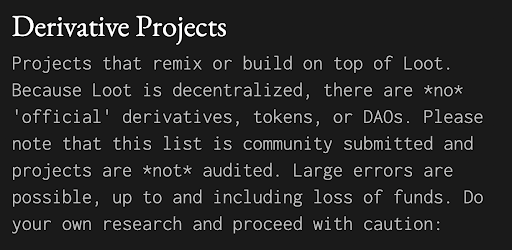 Loot已经建立了自己的官方网站,生态已有的项目可以在网站上进行查询。有趣的是,官网上有这样一句话——Loot是完全去中心化的,因此没有“官方的”衍生项目,token或者DAOs,很好地体现了Loot哲学和精神价值。