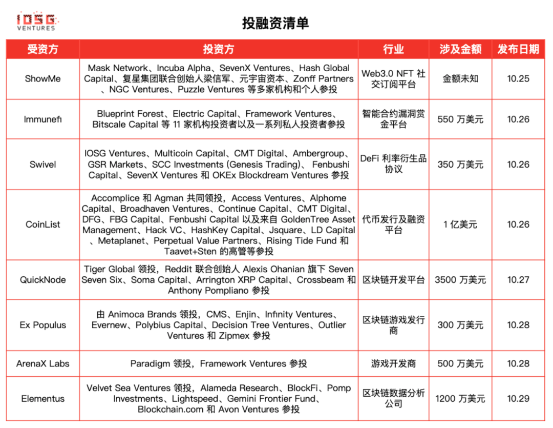 BanklessDAO 拟推出加密货币指数 Bankless DeFi Growth Index (GMI),该指数由一系列小市值 DeFi 代币组成,包括:OHM、SPELL、DYDX、PERP、CVX、RGT、TRIBE、TOKE、DPX、RBN、MPL、Visor 和 FLX。该指数将建立在 Set Protocol 上,拟筛选出有潜力的早期 DeFi 项目,通过市值、二级市场流动性和代币释放等潜在因子设计一个合理权重。HashKey 与 Decentraland 合作建立区块链基金虚拟总部*MetaverseHashKey 虚拟总部(坐标 96,16)将于新加坡时间 2021 年 10 月 27 号 21:00 正式在 Decentraland 上线,并在橱窗中提供限量版的周边服装。用户也可与扭蛋机交互,免费领取限量版 KOL 卡牌 NFT。此外,HashKey 虚拟总部大厅中央设有展示区域,用于陈列基金 Portfolio 以及 HashKey Research 深度研究报告。HashKey 在投资维度上对元宇宙及 NFT 相关项目进行了布局,其近期投资的 NFT 项目包括了 Aurory、Anima、myNFT 等。Part.4 投融资进展Web3.0 NFT 社交订阅平台 ShowMe 完成种子轮融资*NFT 社交订阅平台Gryffindor Labs 旗下 NFT 社交订阅平台 ShowMe 完成种子融资,融资金额未披露,Mask Network、Incuba Alpha、SevenX Ventures、Hash Global Capital、复星集团联合创始人梁信军、元宇宙资本、Zonff Partners、NGC Ventures、Puzzle Ventures 等多家机构和个人参投,本轮融资将为 ShowMe 的发展引进更多战略资源。Immunefi 完成 550 万美元融资,Electric Capital、Framework Ventures 等参投*智能合约漏洞赏金平台Immunefi 完成 550 万美元融资,Blueprint Forest、Electric Capital、Framework Ventures、Bitscale Capital 等 11 家机构投资者以及一系列私人投资者参投,所筹资金将用于推进其在 DeFi 安全领域的服务,为智能合约协议提供资产保护,并对善意黑客进行财务激励。Swivel 完成 350 万美元融资,IOSG Ventures、Multicoin Capital 等参投*DeFi 利率衍生品协议 去中心化固定利率贷款和利率衍生品协议 Swivel 完成 350 万美元战略轮融资,IOSG Ventures、Multicoin Capital、CMT Digital、Ambergroup、GSR Markets、SCC Investments (Genesis Trading)、 Fenbushi Capital、SevenX Ventures 和 OKEx Blockdream Ventures 参投,所筹资金将用于接洽交易伙伴、加强流动性,并为 2021 年 10 月上线的 Swivel V2 做准备。此前 Swivel 进行了 115 万美元种子轮融资,总融资金额为 465 万美元。CoinList 完成 1 亿美元 A 轮融资,Accomplice 和 Agman 共同领投*代币发行及融资平台 CoinList 完成 1 亿美元 A 轮融资,该轮融资使 CoinList 估值达到 15 亿美元,Accomplice 和 Agman 共同领投,Access Ventures、Alphome Capital、Broadhaven Ventures、Continue Capital、CMT Digital、DFG、FBG Capital、Fenbushi Capital 以及来自 GoldenTree Asset Management、Hack VC、HashKey Capital、Jsquare、LD Capital、Metaplanet、Perpetual Value Partners、Rising Tide Fund 和 Taavet+Sten 的高管等参投,所筹资金将用于扩展 CoinList 的服务和运营,以更好地支持采用者与全球社区,同时还将用于推出 CoinList Karma 和 CoinList Governance 等新产品,以提高协议参与度,并继续在加密世界中找到最好的新项目,帮助他们及其社区取得成功。QuickNode 完成 3500 万美元 A 轮融资,Tiger Global 领投*区块链开发平台 QuickNode 完成 3500 万美元 A 轮融资,Tiger Global 领投,Reddit 联合创始人 Alexis Ohanian 旗下 Seven Seven Six、Soma Capital、Arrington XRP Capital、Crossbeam 和 Anthony Pompliano 参投。本轮融资将用于开发更多产品并支持更多区块链。QuickNode 表示,目前公司的客户包含了 Rarible 等 NFT 平台以及传统金融机构。Hyype 由 Elevation Capital 领投的新一轮融资,10 月 27 日正式启动*NFT 社交网络 Hyype 完成 250 万美元新一轮融资,Elevation Capital 领投,Electric Capital 参投,其他天使投资者包括 Santiago R Santos、Cuy Sheffield (Visa)、Deepak Menon (Microsoft) 等,募集资金将用于扩充核心团队。该项目创始人为 Supriyo Roy (曾在亚马逊、微软等公司负责用户体验工作),还有一位创始人名叫 Scott Goldschmidt,平台于 10 月 27 日正式启动。Ex Populus 完成 300 万美元融资,Animoca Brands 领投*区块链游戏发行商 Ex Populus 宣布完成 300 万美元种子轮融资,由 Animoca Brands 领投,CMS、Enjin、Infinity Ventures、Evernew、Polybius Capital、Decision Tree Ventures、Outlier Ventures 和 Zipmex 参投。Ex Populus 第一款游戏是 LAMO,混合了快节奏的射击游戏和基于区块链的收集功能,其中可玩的游戏角色来自于流行文化中的英雄。ArenaX Labs 完成 500 万美元种子轮融资,Paradigm 领投*游戏开发商 游戏开发商 ArenaX Labs 完成 500 万美元种子轮融资,Paradigm 领投,Framework Ventures 参投,所筹资金将用于加速以太坊原生玩家对战游戏 AI Arena 的开发进程。AI Arena 是一个基于以太坊的玩家对战游戏,其中角色由人工智能(AI)提供动力,每个 AI Arena 玩家拥有自己的战士,且战士们包含典型的 NFT 属性,如力量、速度和精度,同时战士们还嵌入了人工神经网络,使它们能够自主操作。a16z 宣布投资社交 DAO「Friends with Benefits」 ,投资金额未公布*DAOa16z 宣布投资社交 DAO「Friends with Benefits」,投资金额未公布。a16z 称将对其提供指导,并计划通过授权赋予主要社区成员权力积极参与治理。「Friends with Benefits」是一种新型 DAO,加入 FWB 需要一份书面申请,由社区本身审查和投票,以及最低限度的 FWB 代币来代表 DAO 中的所有权。自 2020 年 9 月作为社会实验开启以来,FWB 已发展到近 2000 名成员,除世界各地的一系列派对外,还推出了「token-gated events」应用程序、NFT 画廊、以 Web3 为中心的编辑业务、虚拟音乐工作室等,接下来推出的「FWB Cities」将旨在扩大