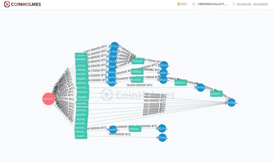 CoinHolmes 通过对这些黑产地址的持续监控和分析,并结合已有的逾 2亿 地址标签,在追踪中发现,OTC 也是重要的出金渠道。部分 PlusToken BTC 资产通过类似 ChipMixer 的工具进行混淆,再通过场外 OTC 渠道的方式卖出。为了逃避资产追踪和交易所的冻结,跑路方不断设障,采用了资产多层转移切分—混淆—场外 OTC 卖出的方式进行洗币。
