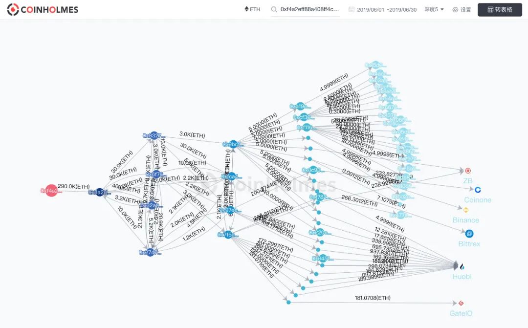 据 CoinHolmes 图谱显示,Plustoken 的整个链上资产转移包含多个数字地址,多笔交易经过多层分散转移、混币服务体统、流入 KYC 服务机构(包括火币、ZB、Gate)和免 KYC服务机构和暗网,最终编织成一个密集、复杂的网。