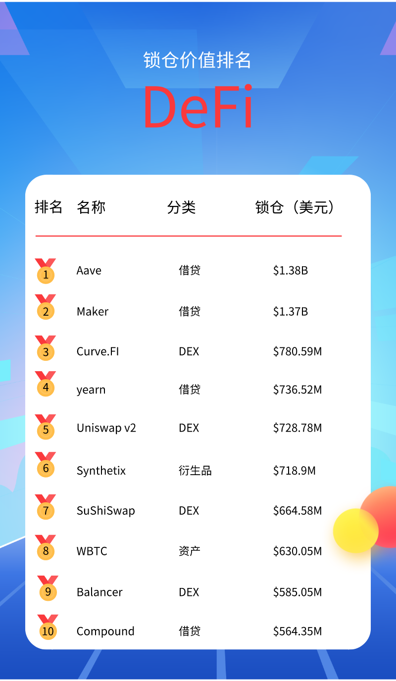 根据上下图以太坊DeFi项目榜单,在锁仓价值排名前十的项目中,共4个借贷类项目,4个DEX项目,其中锁仓价值排名前两位的Aave和Maker均为借贷类项目。
