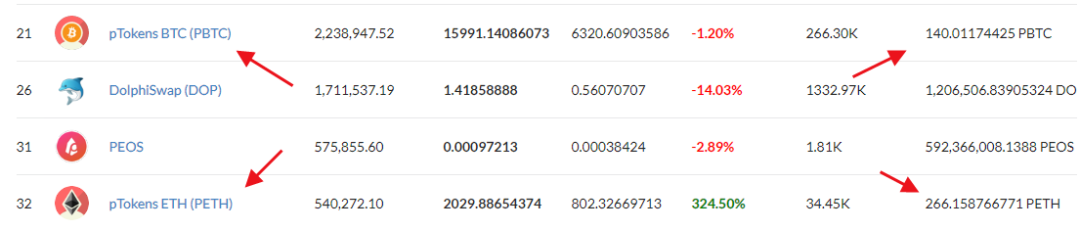 如上图所示,目前市值最高的pTokens是PBTC,已经达到140多个,当前市值近1500万。