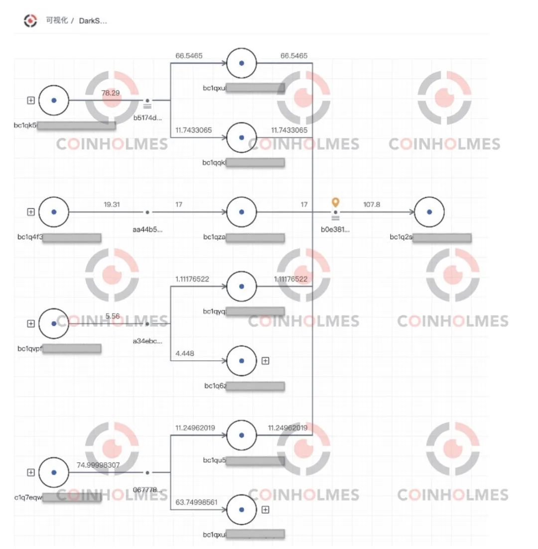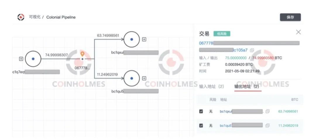这一点从 PeckShield「派盾」旗下的反洗钱反欺诈系统 CoinHolmes 也可以看出,北京时间 5 月 9 日 Colonial Pipeline 交付赎金 75 BTC 后,这 75 BTC 被分别转至开头为 bc1qxu 和开头为 bc1qu5 的两个钱包地址,赎金占比分别大约为 84% 和 16%。