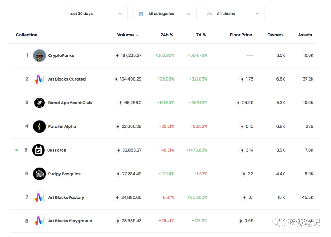 截止到蓝狐笔记写稿时,过去30天,Art Blocks平台推出的生成艺术品NFT在OpenSea上销售量仅次于CryptoPunks。