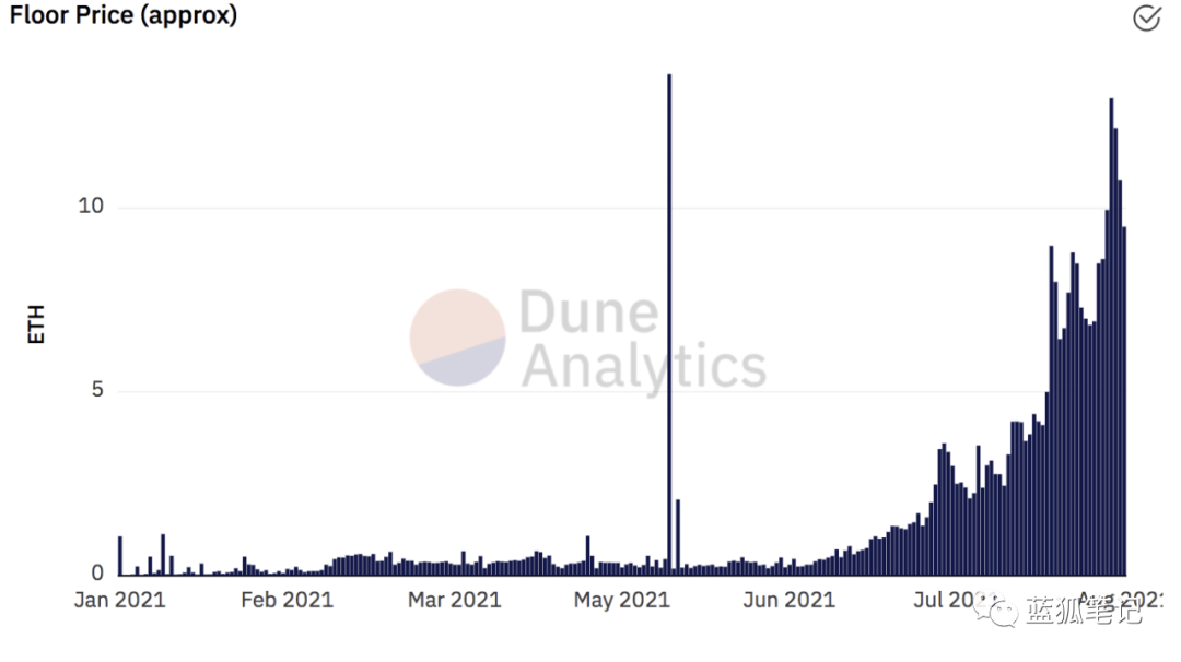 (Art Blocks的生成艺术作品的地板价变化趋势,Dune Analytics)