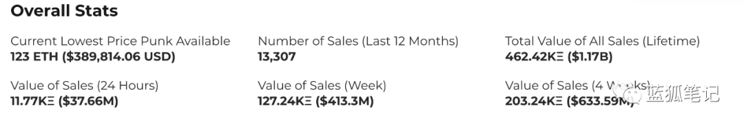 按照蓝狐笔记写稿时,Cryptopunks地板价为123ETH,相当于38.9万美元。