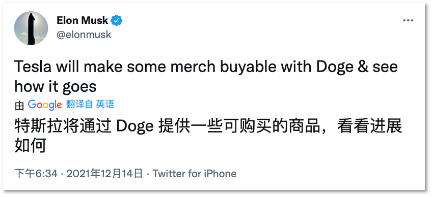 「特斯拉将通过 Doge 提供一些可购买的商品,看看情况如何。」12月14日,特斯拉创始人埃隆·马斯克在推特上发布了有关DOGE的用例动态。