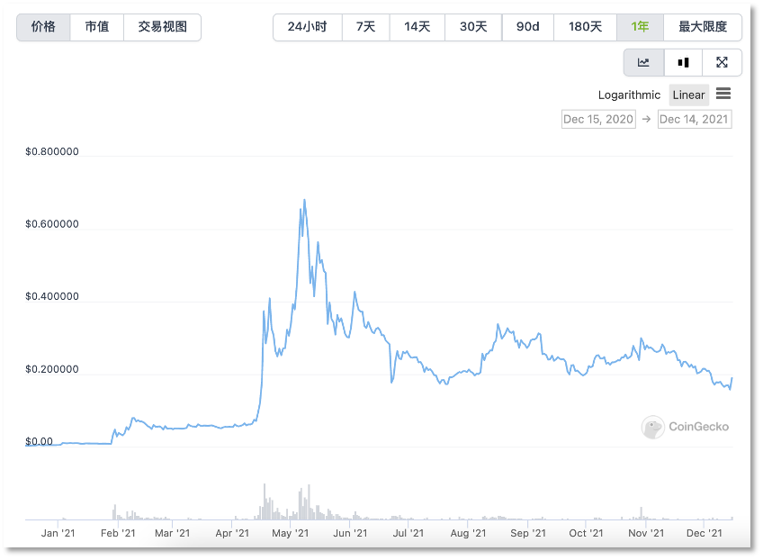 根据Coingecko数据,马斯克关于狗狗币的推文,包括他称狗狗币为「人民的加密货币」的推文,帮助该加密资产在过去一年里飙升了14406%。要知道,年初的狗狗币仅有0.0047美元,到了今年5月,也就是马斯克喊单加密资产最密集的那个月里,狗狗币达到历史最高价0.6818美元,但在此后的2个月里又跌至低点0.1728美元,比历史高点下跌74.6%。
