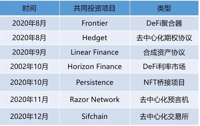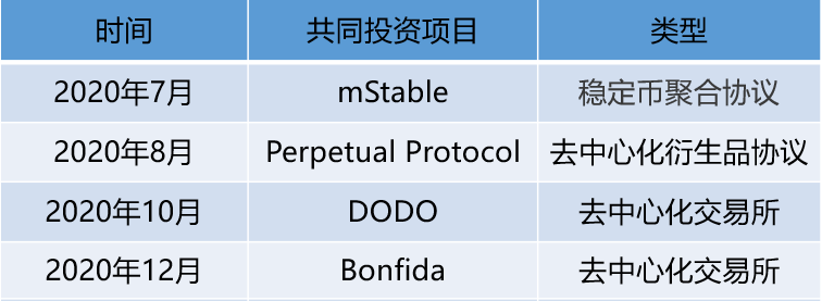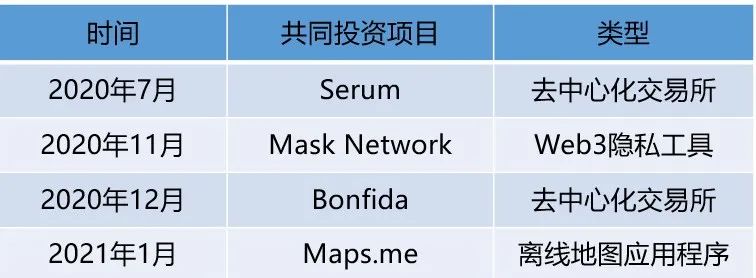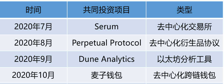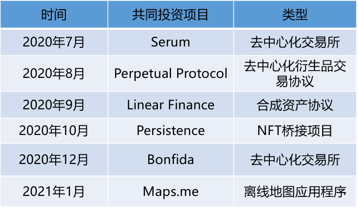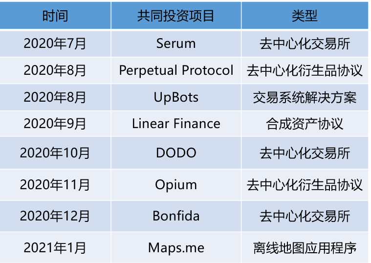 2020年6月底,SBF主导的去中心化交易所Serum宣布完成私募轮融资,参投机构包括Genesis Block、CMS Holdings以及Sino Global Capital。2020年8月,去中心化衍生品交易协议Perpetual Protocol完成180万美金融资,Multicoin Capital领投,Three Arrows Capital、CMS Holding、Alameda Research参投。2020年9月,合成资产协议Linear Finance获180万美元私募融资,Alameda Research、CMS Holdings、Genesis Block、NGC Ventures等机构领投。2020年10月,使用NFT桥接传统金融及DeFi的项目Persistence宣布完成370万美元的私募轮融资,Genesis Block、NGC Ventures、Alameda Research等机构参投。2020年11月,去中心化衍生品协议Opium宣布完成325万美元融资,Alameda Research、CMS Holdings等机构参投。2020年12月,SBF主导的去中心化交易所Bonfida宣布筹集450万美元种子轮融资,CMS Holdings领投,Sino Global Capital、Three Arrows Capital、Genesis Block Venture等机构参与。
