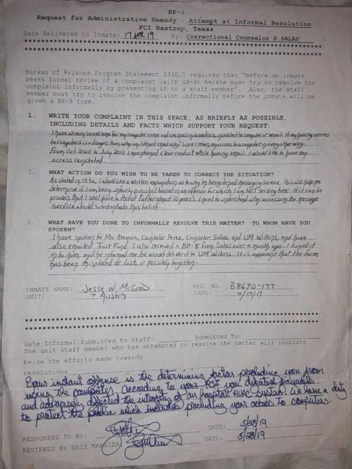 Jesse McGraw每年提交表格,申请恢复电子邮件特权