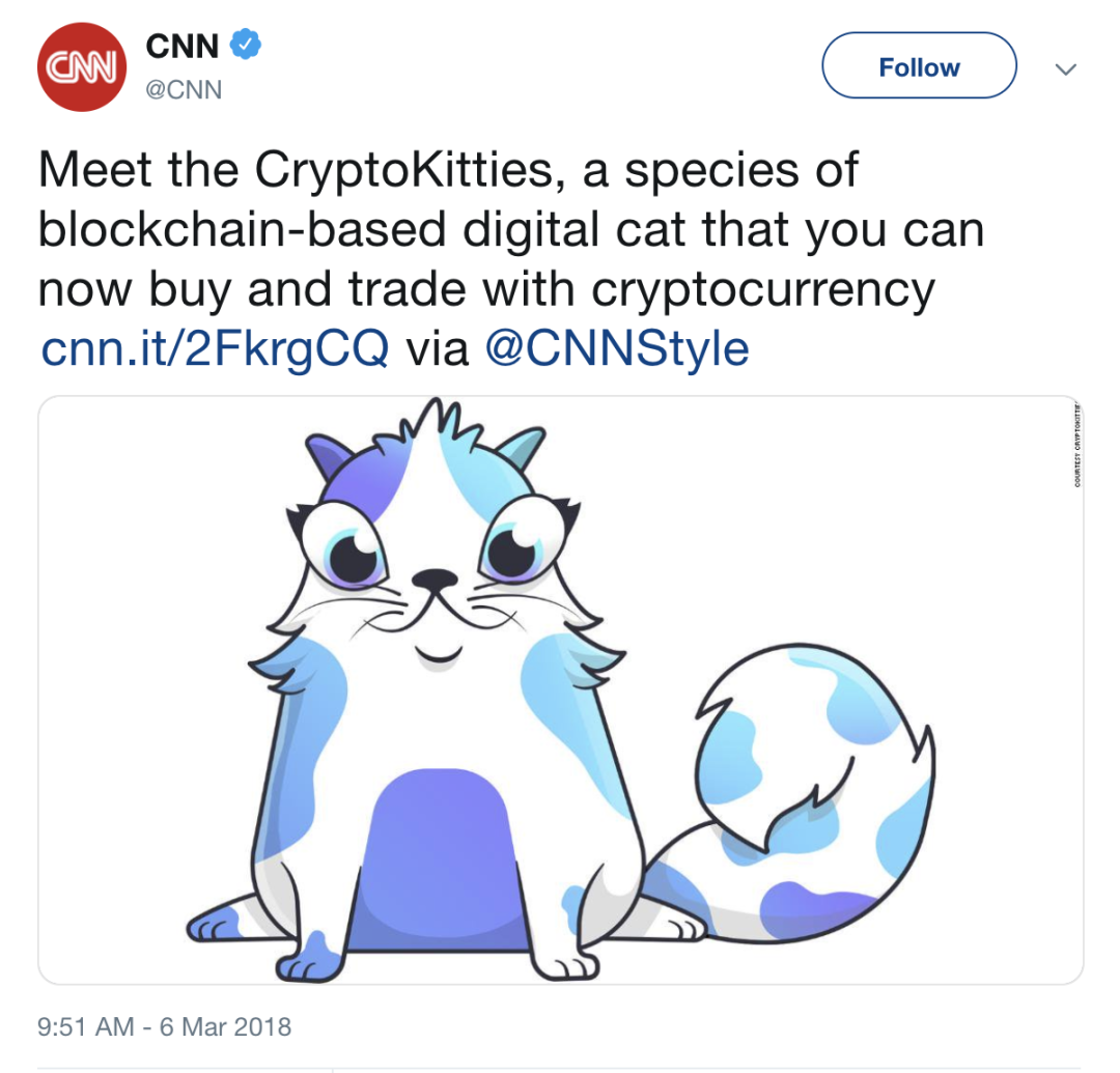 随着CryptoKitties的出现,NFT成为主流。CryptoKitties是一款基于区块链的虚拟游戏,允许玩家收养、饲养和交易虚拟猫。这只加密猫就在区块链上!从Coindesk到CNN,这个不可思议的项目似乎出现在每个新闻台上。究其原因,可能是因为游戏堵塞了以太坊或者是因为人们通过交易获得了暴利。