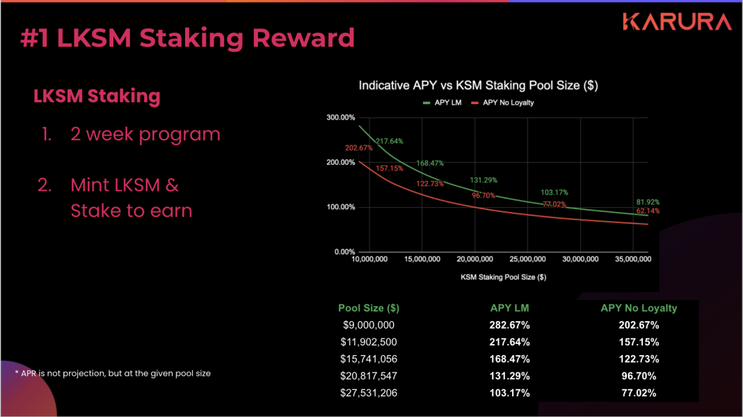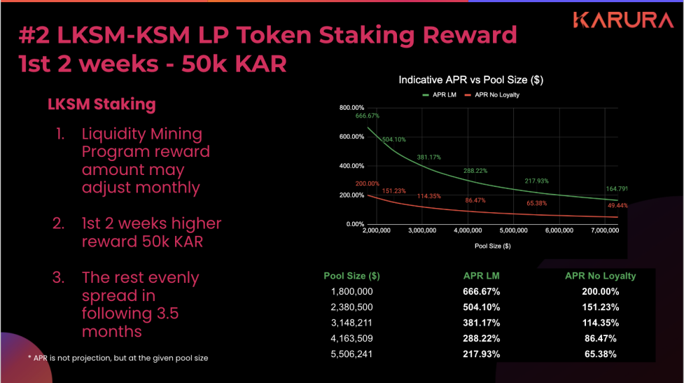 在 LKSM 逐步上线 1 月后,本次将推出 LKSM 的流动性挖矿计划。为 KSM 持有人提供丰厚的 KAR 奖励。