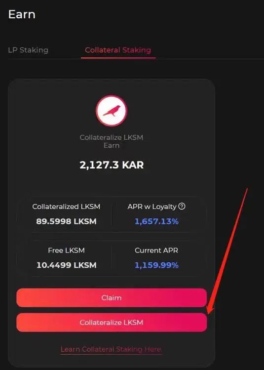提示:如果你在此 LKSM 激励计划开始之前已经质押 KSM 并铸造了 LKSM,并且你为了借出 kUSD 而抵押了 LKSM 创建了 Vault ,你只需在 Karura 中的“Earn”菜单中的「Collateral Staking」中再次进行 LKSM 的质押(Stake )操作。