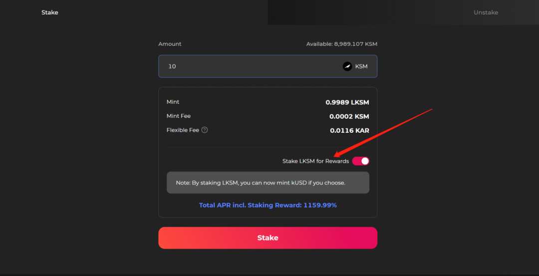 请注意,这个质押(Stake)操作本质上是自动帮你开启了 LKSM 抵押债仓,因此你可以利用该债仓借出 kUSD。