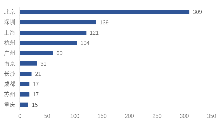 从信息服务备案的区域分布来看,北京(309)、深圳(139)、上海(121)、杭州(104)、广州(60)等五个一线城市的备案数量遥遥领先,五市备案总数占比超过72%。更进一步,备案数量排名前十的城市占比超过82%。
